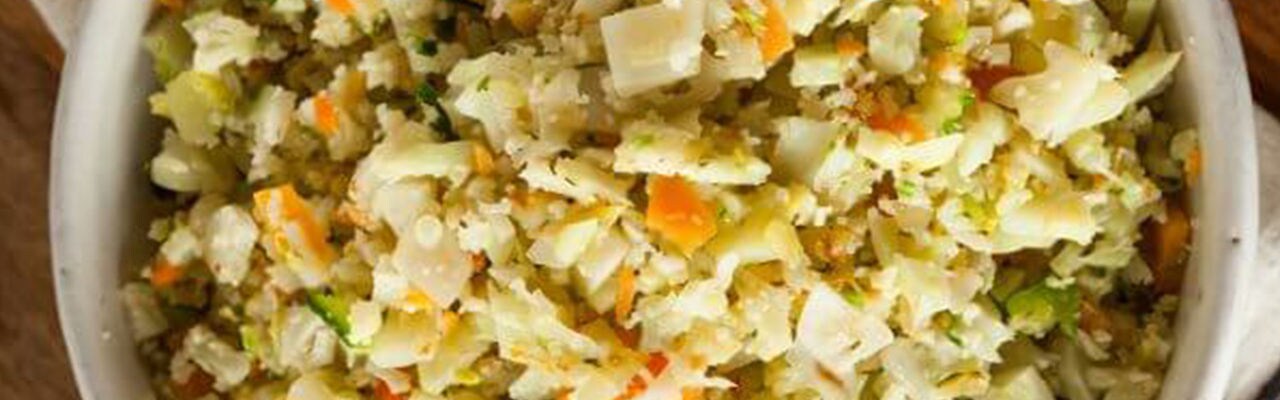 - Fügen Sie das Dressing und den abgekühlten Blumenkohl zu den anderen Zutaten hinzu, die Sie in die große Schüssel gegeben haben. Schwenken, bis alle Zutaten eingearbeitet sind und der Blumenkohl mit dem Dressing überzogen ist. Nach Belieben mit einer Prise Paprika und etwas gehackter Petersilie bestreuen.