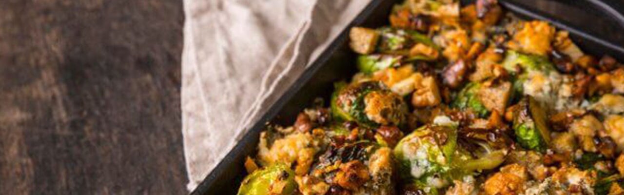 - Die Reste des Rosenkohls in einer gebutterten Pfanne anrichten und den Käse und die Semmelbrösel darauf verteilen.