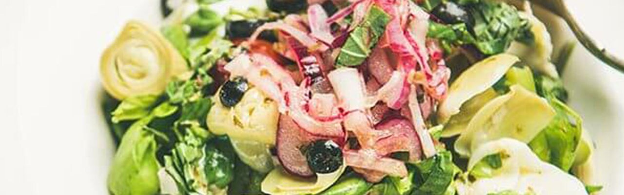- Artischocken und Fenchel mit einem Mandolinenhobel in Scheiben schneiden. In eine große Schüssel geben und mischen.