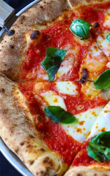 - Natáhněte a poklepejte 1 kuličku těsta, abyste vytvořili kruh o průměru 2,5 cm. Těsto položte na lehce pomoučenou kůru od pizzy. Vezměte zbylou rajčatovou těstovinovou omáčku, kterou použijete jako omáčku na pizzu na základně a rozložte ji tak, aby pokryla do 2 cm od okraje těsta. Na zbylou omáčku naaranžujte 5 plátků sýra mozzarelly a nahoře položte 5 listů bazalky. Pizzu pokapeme 1 polévkovou lžící olivového oleje a posypeme mořskou solí podle chuti. Opakujte pro 3 zbývající kuličky těsta.