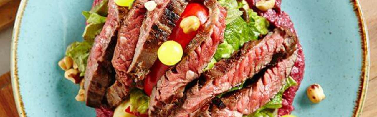 - Uspořádejte zeleninu na talíři; Dochuťte solí a pepřem. Pokapeme citronovou šťávou a 1 polévkovou lžící. Házet řepu v misce s octem a zbývající 1 polévková lžíce. olej; Dochuťte solí a pepřem. Uspořádejte přes zelené. Plátek steaku 1/2 "tlustý; Top greeny s cibulkou a masem. Nalijte zbývající šťávy; Ochuťte solí. Podávejte s aioli.