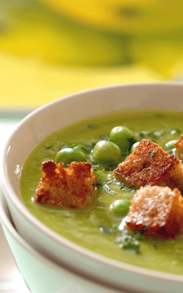 - Pomocí štěrbinové lžíce vyjměte čtvrtinu zeleniny z pánve a odložte je stranou. Zbývající zeleninu a vývar rozmixujte v kuchyňském robotu nebo pomocí tyčového mixéru do hladka, pak promíchejte vyhrazenou zeleninu, nasekanou mátu a trochu koření. Podávejte s chlebem na boku.