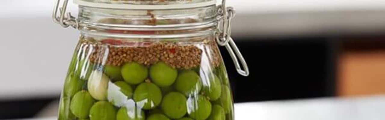 - Naplňte sklenici zelenými švestkami a mezi ně vložte nakrájený citron a česnek.