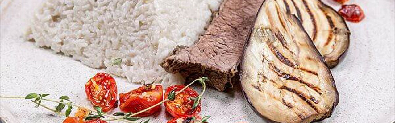 - Podávejte položením 2 cm silného plátku masa, poté 2 plátky grilovaného lilku. Položte rajčata a brambory na stranu a miska je připravena k podávání.