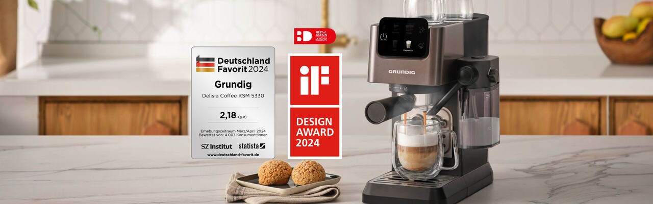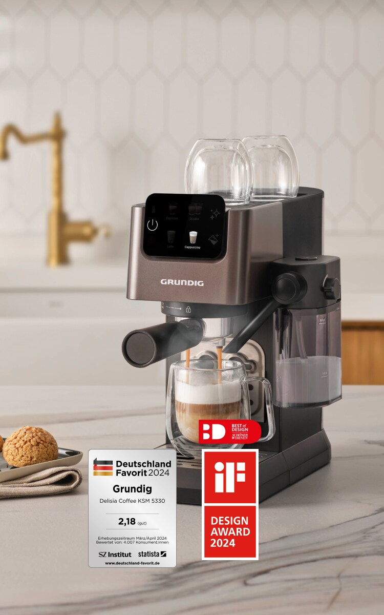 Modern, schlank, zeitlos, nachhaltig sowie robuste Qualität und intuitive Touch-Display-Bedienung: Dies sind nur einige der Designmerkmale, mit denen die Siebträgermaschine Delisia Coffee KSM 5330 von Grundig sowohl die Jury des iF Design Awards als auch die Jury des Best of Design Awards überzeugen konnte. Der iF Design Award ist eine der wichtigsten Designauszeichnungen der Welt, bei dem jährlich internationale Designer:innen, Architekt:innen und Unternehmen ihre Designs anhand der Kriterien „Form“, „Funktion“, „Differenzierung“, „Idee“ und „Wirkung“ von unabhängigen Expert:innen bewerten lassen. Um herausragendes Design in allen Facetten geht es auch beim Best of Design Award, dem Design-Preis von Schöner Wohnen. Europas größtes Einrichtungsmagazin möchte mit dem Award seinen Leser:innen ausgezeichnetes Design näherbringen und über Trends und neue Produkte informieren.