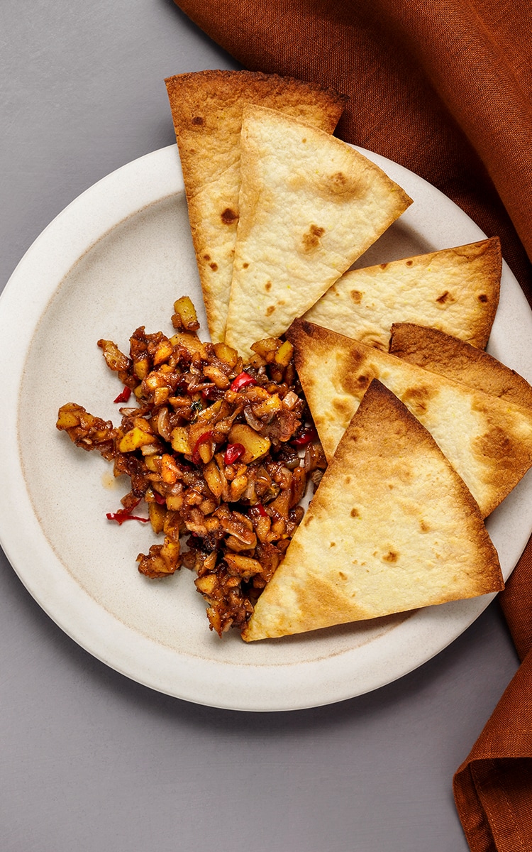 - Skær tortillaen i trekanter, og steg dem i en forvarmet ovn på 150 °C.