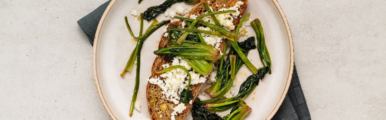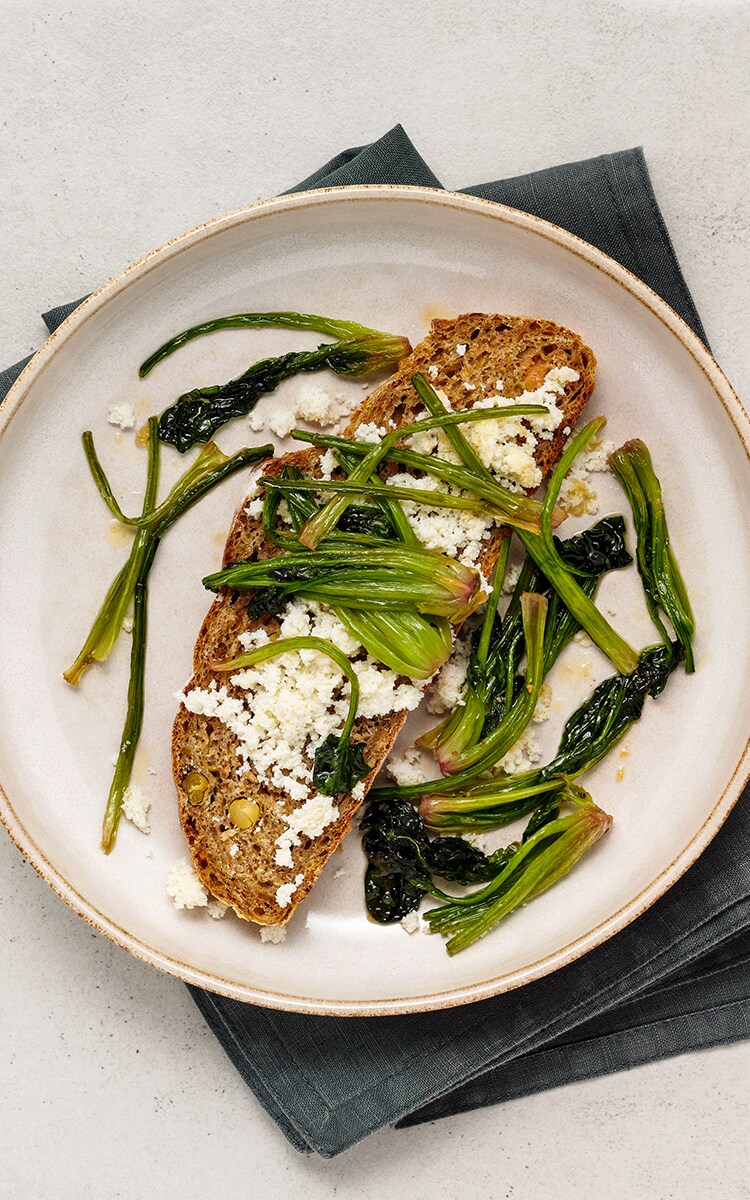 Place the caramelized spinach roots and crumbled leftover cheese on the two slices of bread.