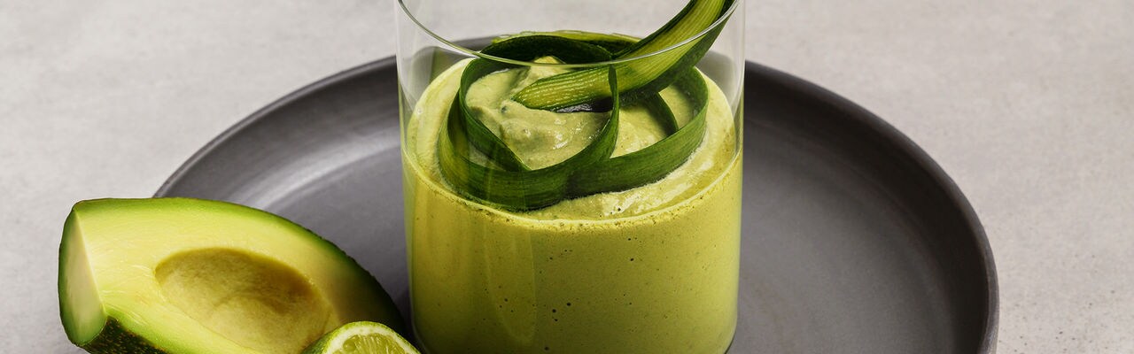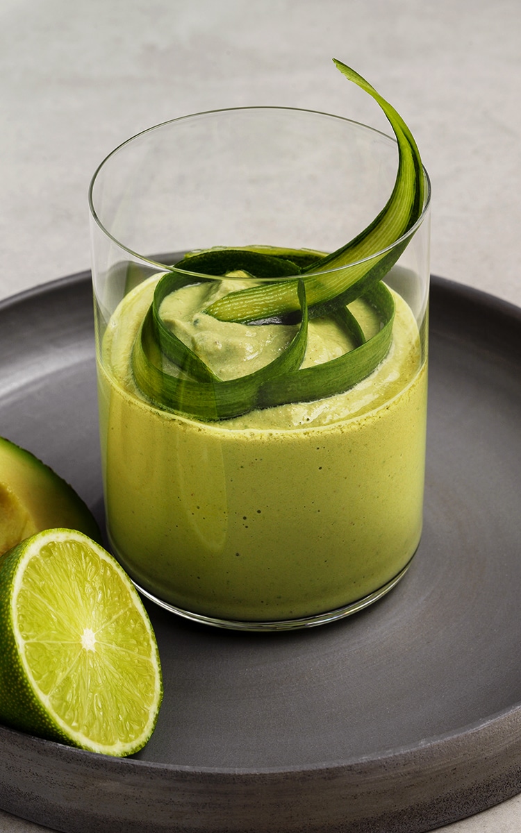 - En una licuadora, combina el pepino, las espinacas, el jugo y la ralladura de lima, la manzana, la leche de soja, el aguacate y las nueces.
