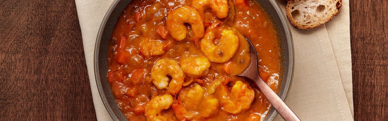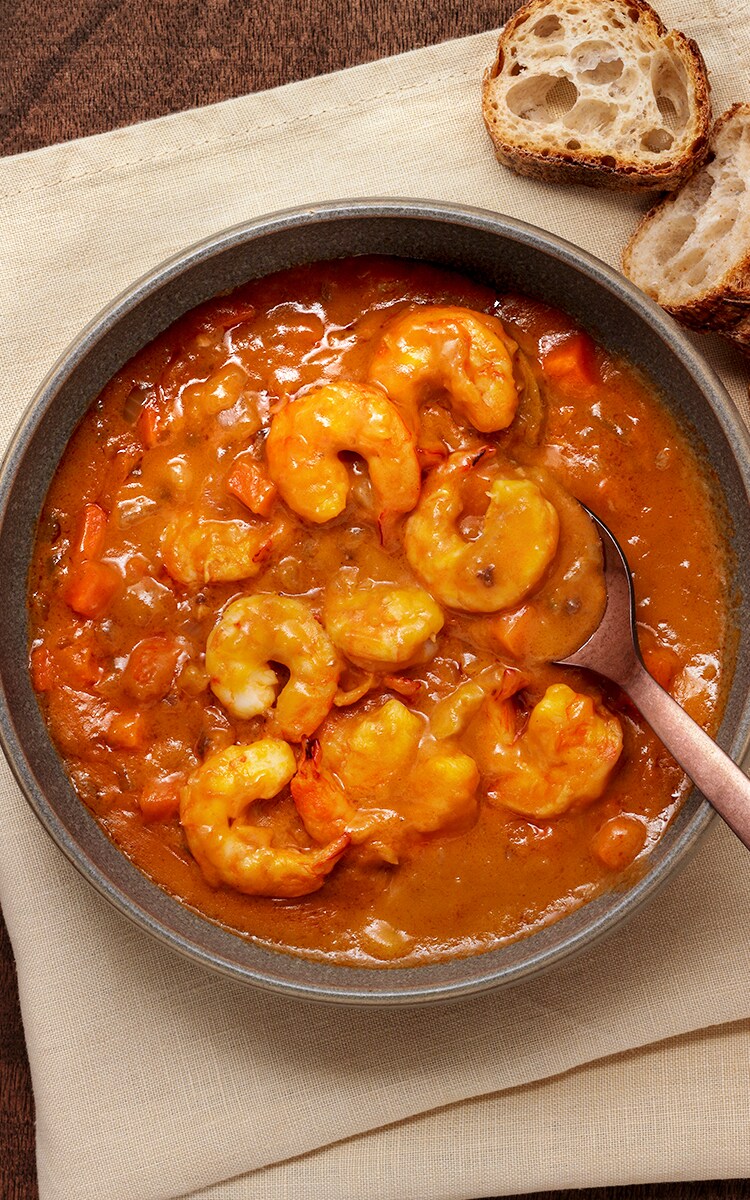 - Precalienta el horno a 180 °C, luego coloca los camarones en la cazuela engrasada, vierte la salsa bisque sobre ellos y hornea en el horno durante 5 minutos.