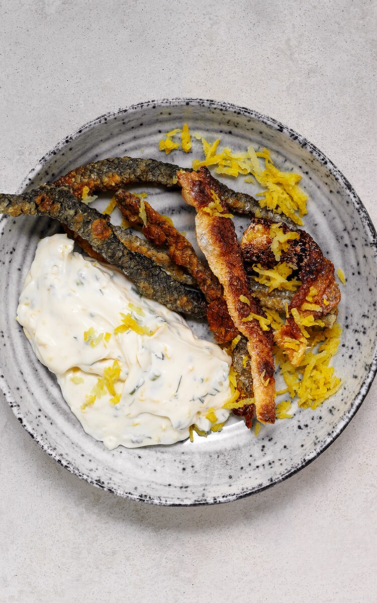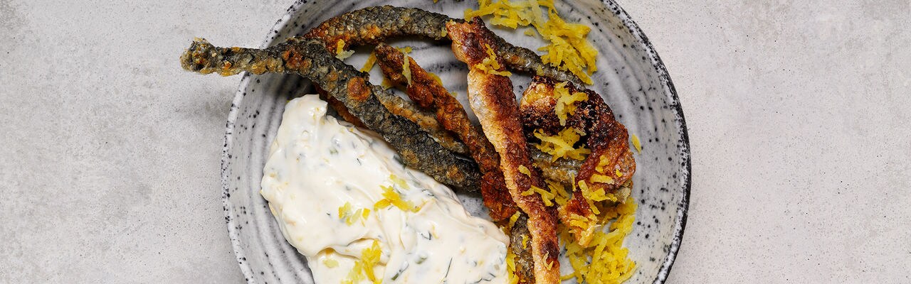- Sirve las pieles crujientes con la mayonesa de hierbas frescas.