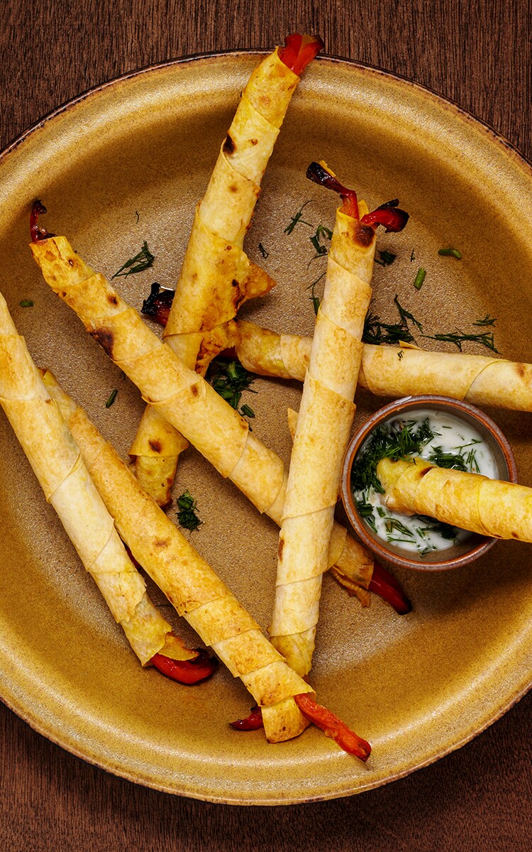 - Sirve los rollitos de masa filo crujientes calientes, acompañados de la refrescante salsa de yogur.