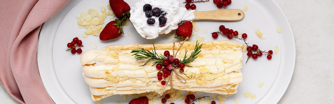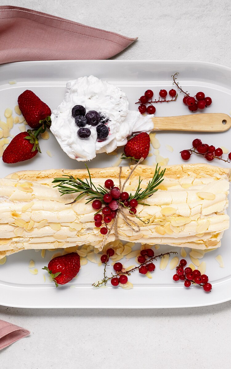 - Agrega fresas y frambuesas como relleno y cuidadosamente enrolla el merengue.