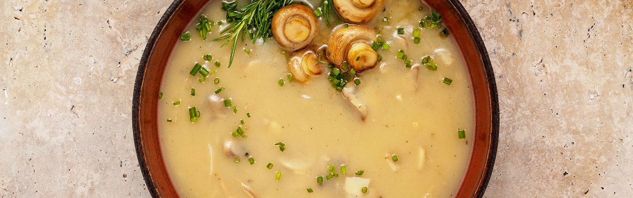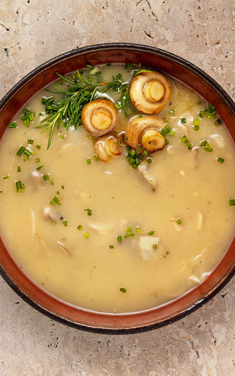 - Calienta la mantequilla en una olla, añade la cebolla y el ajo picados, y sofríe durante 3 minutos. Añade las setas y cocina por 5 minutos. Espolvorea la harina por encima y sofríe por un minuto más.