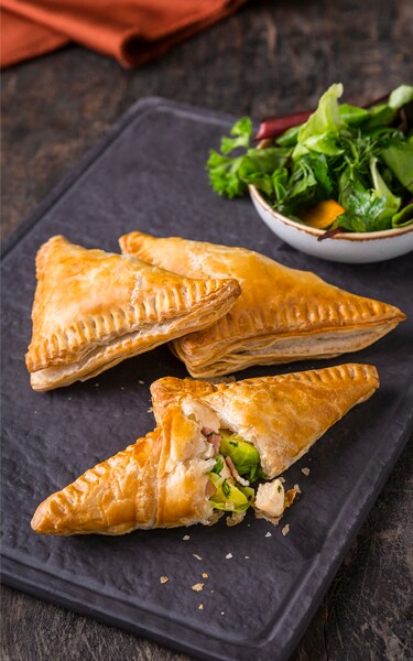 4. Extiende el hojaldre. Coloca el relleno en el centro de cada hojaldre y, a continuación, unta el borde de cada uno con un poco de agua. Dóblalos por la mitad y presiona. Dobla los bordes para sellarlos.