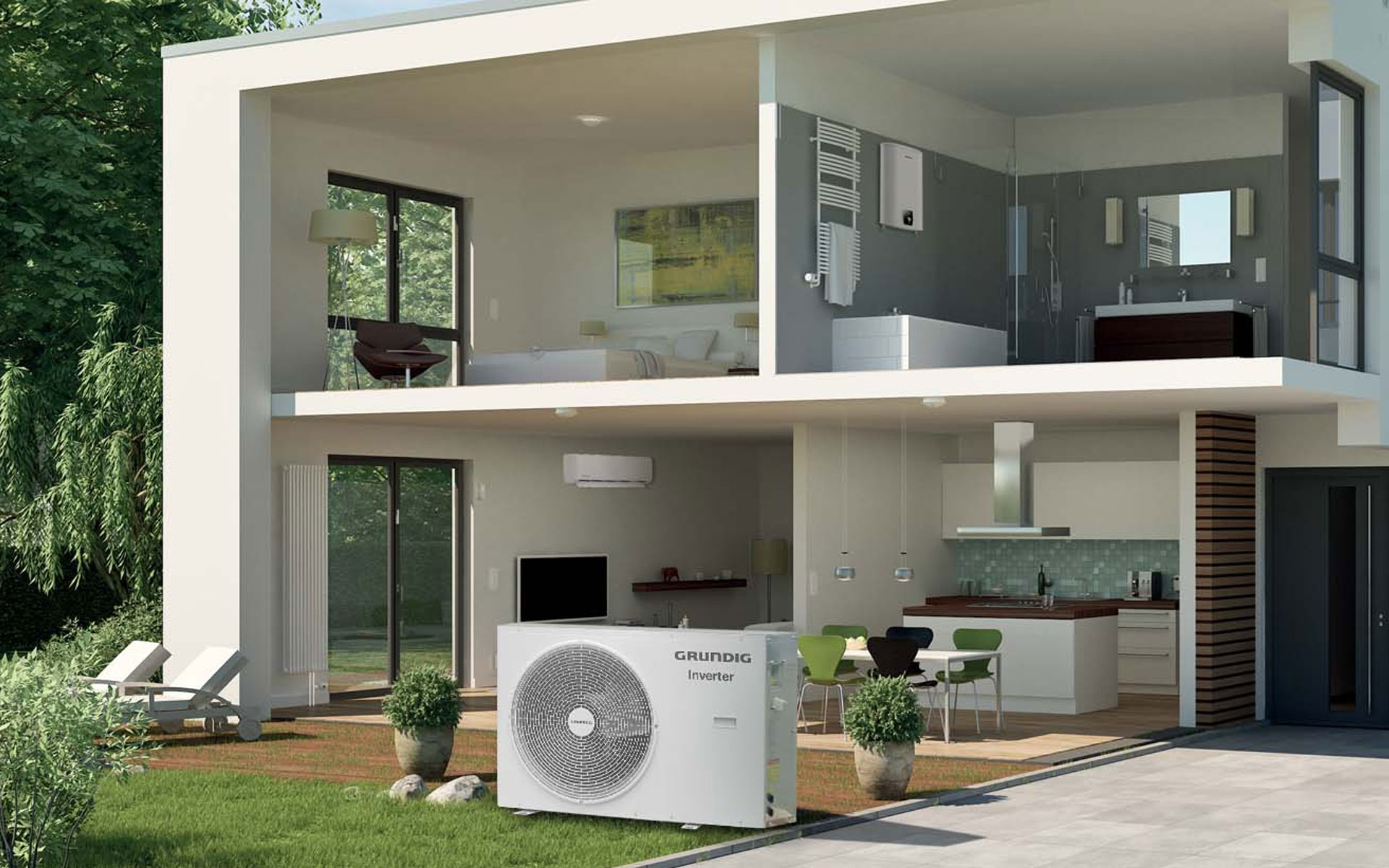 Les pompes à chaleur Grundig sont non seulement capables de chauffer, mais aussi de refroidir des environnements, offrant un confort toute l'année avec un seul système.