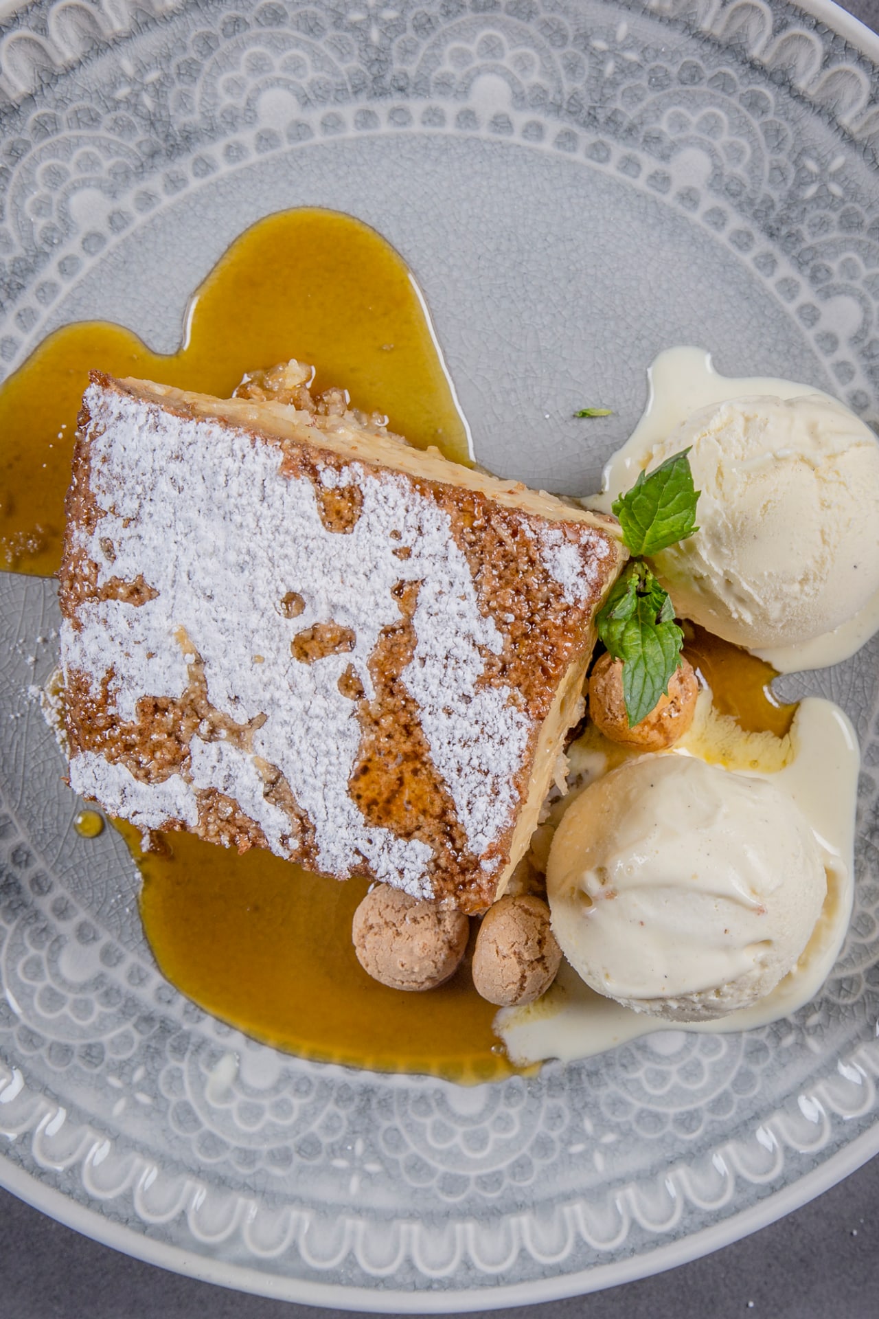 - Hell hvitt sukker i en panne og tilsett 1 ss vann. Vend på panna for å smelte sukkeret på den laveste varmen. Unngå å bruke skje for å røre i blandingen. Når det har smeltet helt, skrur du av varmen og lar det kjøle seg ned litt. Tilsett mandarinjuicen og kok det på lav varme. Blandes til det er jevnt. Server kaken i stykker med en kule vaniljeis, og hell mandarinkaramellen på toppen.