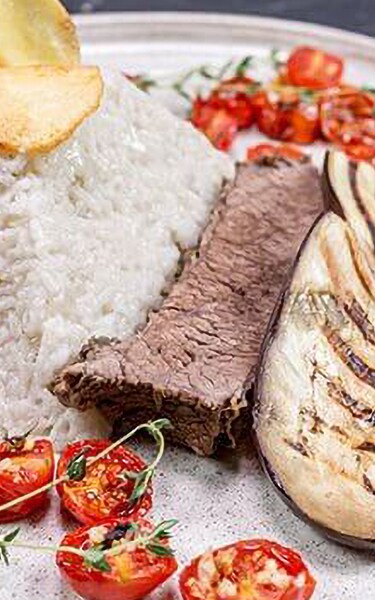 - Serve by laying a 2cm thick slice of meat, then 2 slices of grilled eggplants. Lay the tomatoes and potatoes on the side, and the dish is ready to serve.