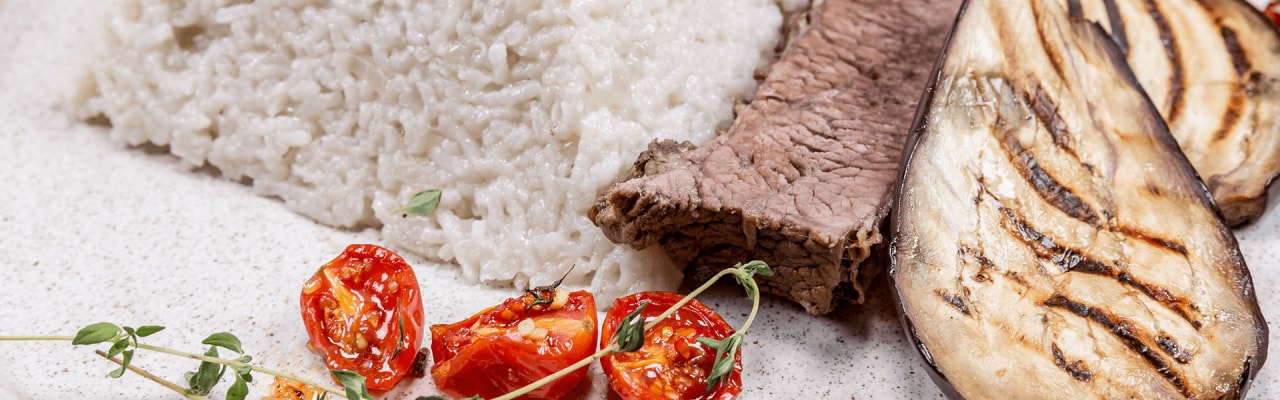 - Lägg en 2 cm tjock skiva kött och 2 skivor aubergine på tallriken. Lägg tomater och potatis vid sidan av köttet och servera.
