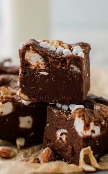 - Take the biscuits, 100g mini marshmallows and up to 100g of additional ingredients (dried fruit, nuts, popcorn, honeycomb), if you like, and stir into the chocolate mixture until everything is completely covered.