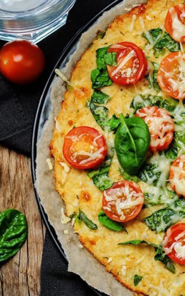 - Take cauliflower into a large bowl and mix well with mozzarella, oregano, basil, salt, garlic powder, and an egg. Place in a tray and knead it into a pizza dough.