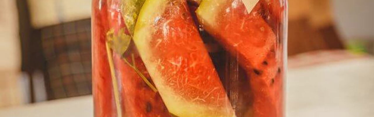 - In a saucepan, combine the reserved liquid with the remaining ingredients. Bring to a boil over medium-high heat, stirring until sugar dissolves. Simmer for 15 minutes, until slightly reduced. Pour over watermelon rinds in a bowl. Place plate over top to keep rinds submerged in liquid. Cover and refrigerate for one day. Transfer to a glass jar and keep sealed in the refrigerator for up to 2 weeks